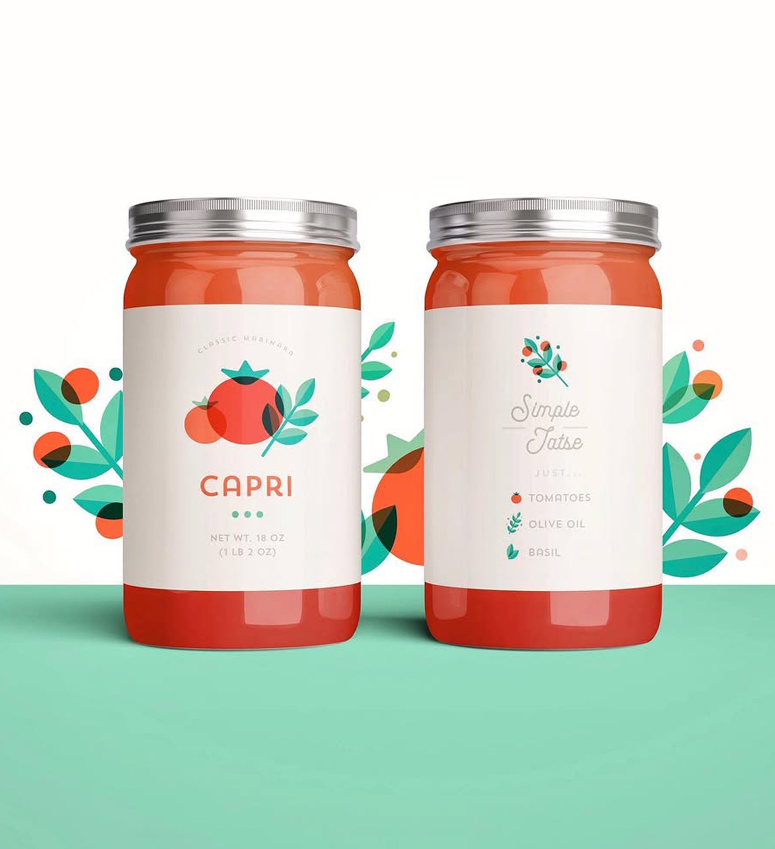 Packaging design for a fictional tomato sauce, Capri. Inspired by the colors/feel of real, fresh, organic tomato sauce ingredients.